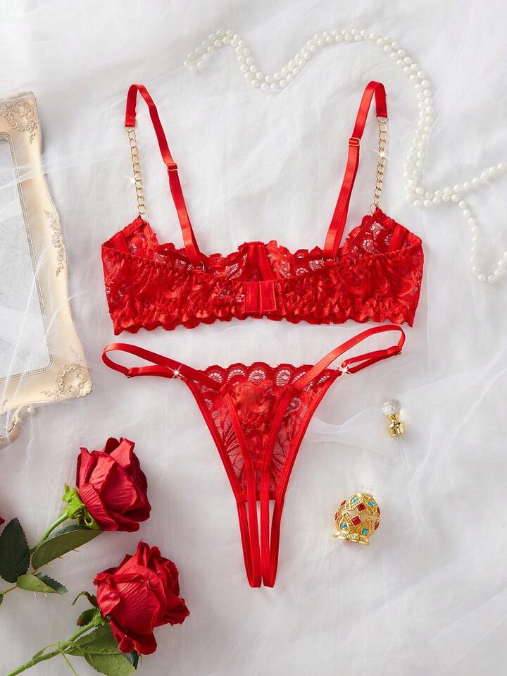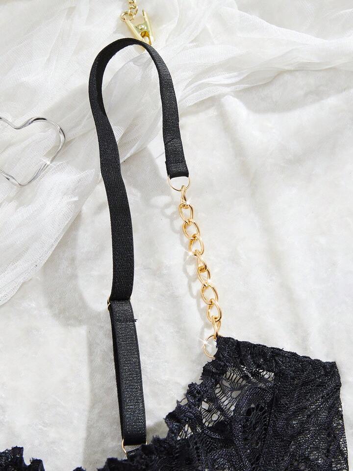 The Lace Lingerie Crotchless Bra and Panty Set combines sheer lace with a gold strap chain for an alluring aesthetic. Available in pink, black, and red, this set offers a stylish option for intimate wear, enhancing the wearer's confidence while ensuring comfort and breathability.